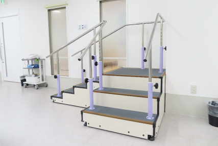 20㎝と12㎝の高さの段差と高さ調整可能な手すりがあり、自宅での日常生活に近い状態で練習を行えます。