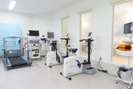 血圧や心電図、呼気ガスを計測しながら、自転車エルゴメータを漕いで測定し、心臓の機能評価や、治療の効果判定、体力測定や運動プログラム作成に利用します。